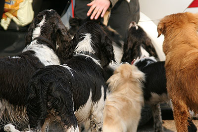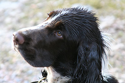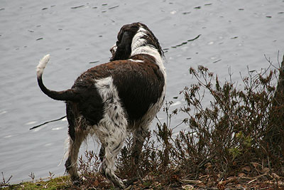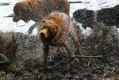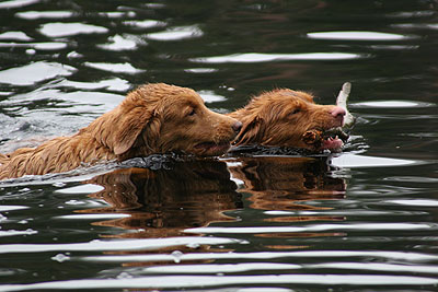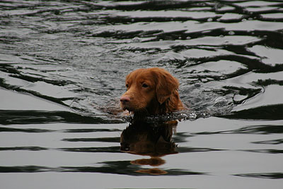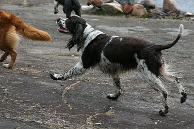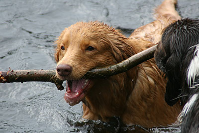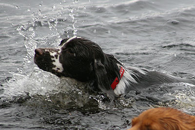 Sanni noutaa, rannalla Sinna, Liinu, Alma.