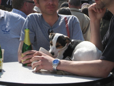 Koira pöydällä olutterassilla