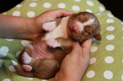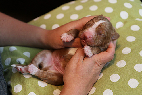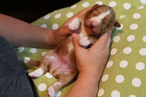 Neljännentoista päivän puolella lämmöt lähti kipuamaan hiljalleen takaisin ylöspäin ja itse asiassa synnytys lähti käyntiin vesien menolla puoli kahdentoista aikaan edellisen vuorokauden puolella. Selattuani edellisiä pentupäiväkirjoja (onpa loistavaa että näitä on olemassa edelleen!), osasin olla rauhallinen sen suhteen, että jaksoin suhteellisen tyynesti (ainakin lähestulkoon koko ajan) odotella, vaikka ensimmäistä pentua ei alkanut kuulumaan tunnin kuluessa. Puolentoista tunnin kohdalla nakkasin Estan pienelle autoajelulle ja köröteltiin pyyhe peffan alla hiekkamökkiteitä muutaman kilometrin verran jouduttamaan synnytystä. Alkoihan ne poltotkin sitten viimein. Ensimmäistä työstettiin jonkin aikaa, Esta kuitenkin rauhallisena pää moneen otteeseen mun polvella puski pentua kanavassa eteenpäin ja viimein, klo 2.35 syntyi ensimmäinen upeamerkkinen poika jalat edellä (olisipa ollut kunnollinen kamera aivan siinä hollilla, pennun tassu oli täysin selkeästi vasten kalvoa, niinniin suloinen). Täydelliset merkit, toinen etusukka jopa polveen saakka. Myöhemmin pennun kuivuttua näin pienen nuppineulan pään kokoisen täplän niskan alaosassa valkoista, tulee varmaan lähes häviämään myöhemmin. Napanuora katkaistiin reippahasti ja pentu putsattiin aivan antaumuksella, tissimaito maistui poitsulle.
