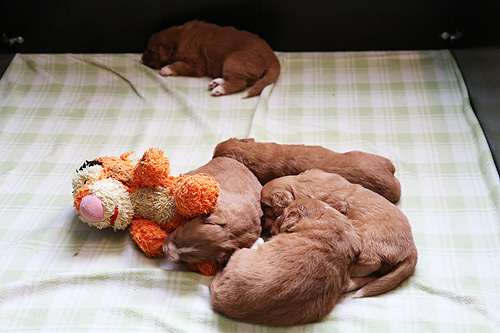 Muutama päivä takaperin alkoi paukkumaan kilo rikki, kolmen pennun siihen jo päästessä ja kahden tullessa kovaa vauhtia perässä. Huimat erot kyllä jo pennuilla, syntyessään isoimman ja pienimmän ero oli 100g, joka toki siinä vaiheessa tuntui melko isolta (vaikka kaikki omasta mielestäni olivatkin oikein hyvän kokoisia), nyt se on jo melkein 300g, pienimmän painaessa (huom, tosiaan muutamia päiviä sitten) 850g ja suurimman ollessa 1110g. En ole punninnut enää päivittäin pentuja. Ensimmäiset kaksi päivää punnitsin kalapuntarilla pipoon ujuttaen pennut kahdesti päivässä, aamuin illoin, mutta luovuin siitä hyvin nopeasti, kun painot nousi niin hyvään tahtiin. Eihän nämä edes pudottaneet painoa ollenkaan, yksikään näistä. Viikon verran sitten punnasin joka ilta, mutta näin senkin lopulta turhaksi (varsinkin kun ei nuo ryökäleet pysyneet siellä pipossa enää), siirryin joka toisen päivän taktiikkaan, tai jopa harvempaan. Silmämääräisesti ja ihan kun syliinkin nappaa niin näkee, kuinka hyvin vankistuvat päivä päivältä.