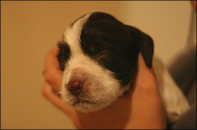 "5 months old bitch. Right size for her age. Feminine head, could have a bit more forehead. Nice eyecolour. Good lenght of neck. Well angul in front. Could have a bit more bone. Nice high on hocks. Puppy movements, who still of course needs to develop. Beautiful coat structure." (Helsinki 10.5.2008, pek- (5))