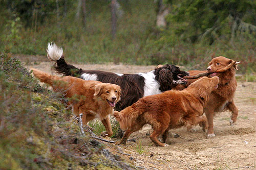Läjä koiraa. Alma, Pertti, Sanni, Sora.