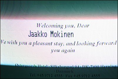 Tanskan puolella ajoimme katsomaan ensin suurin piirtein missä Kibaekin määränpäämme sijaitsee, siitä sitten Herningiin aamupalalle (tuoreita sämpylöitä ja kahvia) ja soitto Anne Marielle olisiko Oskar jo hereillä. :) Kävimme siis heti sunnuntai-aamusta Sannin kanssa moikkaamassa toivottavasti tulevien pentujen isää ja komea oli poitsu kerta kaikkiaan! Oskar rakastui tyystin Sanniin ja ei kauaa mennyt niin pariskunta sai jo toisensa. Saimme ohjeet kuinka löydämme hotellille ja sovittiin koska tulemme taas käymään. Hotelli sijaitsi Herningissä ja kahden aikaan saisimme huoneen käyttöömme, oli siis aikaa tutustua hieman paikkoihin (ulkoilemaan ei tehnyt mieli, vettä tuli edelleen kuin ..) ja löytyihän sieltä hotellin pihalta taas wlankin.