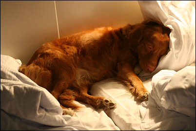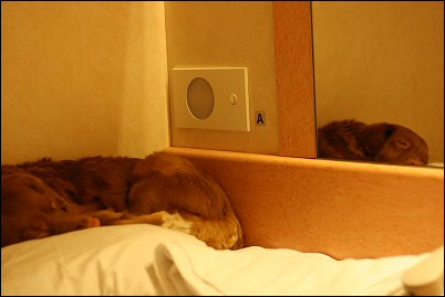 Laivalla kannoin Sannin autokannelta sisätiloihin ettei tassut heti tule ihan öljyisiksi. Tassut kun sai lattiaa vasten, Sanni aloitti villin haistelun ja heilumisen, juma, siis missä ollaan. Portaat juostiin ylös ja hyttikäytävällä vipitettiin vauhdilla. Näki rakkaasta kuinka kivaa oli olla vain mamin ja Jaskan kanssa liikenteessä. :) Hyttimme oli aivan käytävän perällä ja siellä tsekattiin tottakai heti joka nurkka ja sänky oli se Sannin paikka, luonnollisesti. Tuli otettua viltti mukaan ettei lakanat mene ihan sotkuisiksi heti.