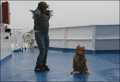 Autolle pääsi vasta kun oltiin aivan satamassa, kannoin Sannin taas öljyisellä kannella. Kukaan ei maissa ollut edelleenkään kiinnostunut koirasta joka notkui välissämme katsellen ihmeissään maailmanmenoa. Eli hyvin saatiin salakuljetettua koira Saksaan. ;)